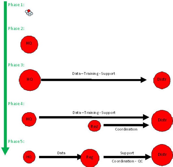 4.5) At this time, the installation phases explained above cannot be matched with the establishment of communications channels, because they depend on the available technology: As soon as communication facilities and bandwidth allow, the District offices will be connected to HQ, and if Regional offices are set up, also to these offices.