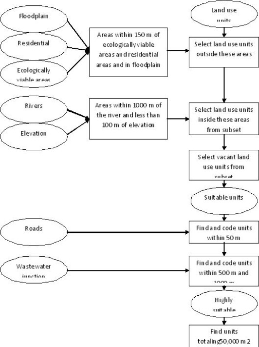 In the third phase, you consider the town’s additional criteria that define the highly suitable units. You find the suitable units within 50 m of a road and those within 500 and 1000 m of the wastewater junction, then tag them with the appropriate codes so they can be identified on the map. You also check to see which units are large enough for the construction of the plant.