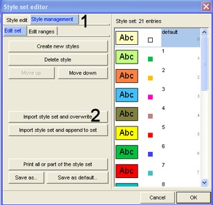 > Style set editor window: Style management > Import style set and overwrite >