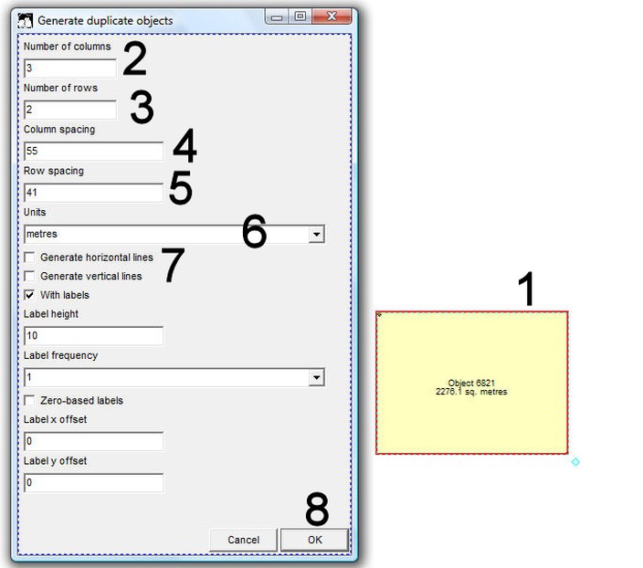 With the Select-tool from the toolbar left, you select the unit(s) to be copied > Main menu > Edit > Show selection manager > Selection Manager window: Actions > Basic operations > Generate duplicate objects > Generate duplicate objects window: Number of columns: Enter the number of copies, you want to have to the right (2) > Number of rows: Enter the number of copies, you want to have above (3) > Column spacing: Enter the meters, you measured under previous step 2 for the width of the object (4) > Row spacing: Enter the meters, you measured under previous step 2 for the height of the object (5) > Units: metres (6) > Leave ‘Generate horizontal lines’ unticked, same with vertical lines (7) > OK (8)