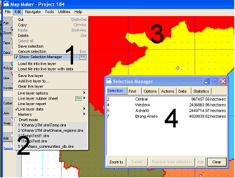 Main menu > Edit > Show Selection Manager (below: 1) > Select-tool (below: 2) > Select unit (or units) (below: 3) > Selection Manager window (below: 4): Display of labels with their area sizes or line lengths