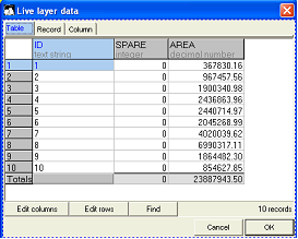 Edit > Live layer data > Edit data, will show you a table, which also has – amongst other data – the area figures: