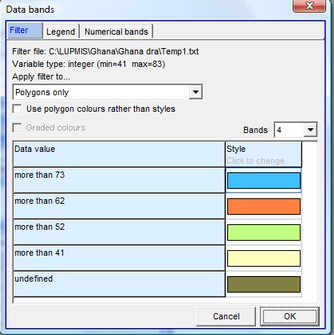> Data bands window: Filter > Apply filter to: Polygons only > Tick: ‘Use polygons colours rather than styles’> Tick: ‘Graded colours’ > Bands: 2 > Click on the gray/colour boxes below ‘Fill colour’ to select the colour range (recommended: Dark colour for the upper box, light colour for the lower box) > OK > OK