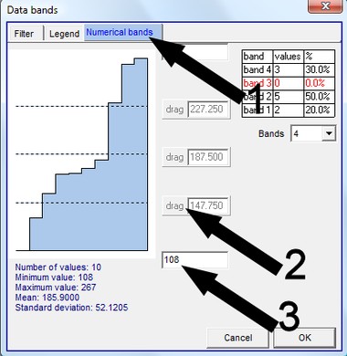If you work with individual colour assignments for different classes, you might be interested in the definition of the bands, i.e. the assignment of colours to numeric values of the database. You find these under ‘Numerical bands’(1, see below).