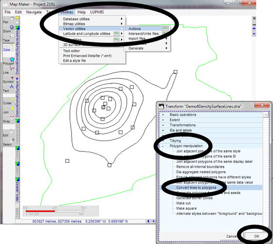Utilities > Vector utilities > Actions > Select DRA line file from previous operation > Polygon manipulation > Convert lines to polygons > OK >