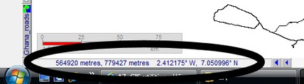 If there are two figures in meters and two in degrees, but the Northing value is less than 5 (like 0.9075 in the sample below), the projection is most likely in War Office (Ghana Grid), either in metes or in feet. The map has to be converted to UTM (see Chapters 5.2.2 and 5.2.3).