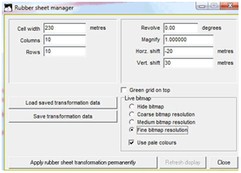 > Rubber sheet manager window: Enter the shift values in horizontal and vertical directions ( in meters, as explained above) > Select ‘Fine bitmap resolution’ > Apply rubber sheet transformation permanently > Preferably, select same file type as source file type (e.g. TIF) > Define new file name (recommended: previous file name, with _shft added to the file name, before the dot and the extension) > Save >