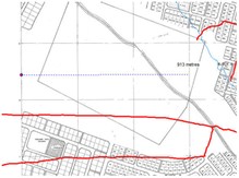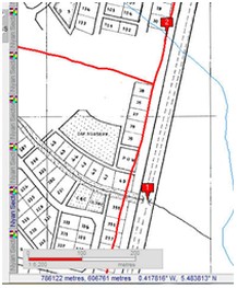1.You calculate, which distance the map has to be moved horizontally (in W or E direction) and/or vertically (in N or S direction). It is recommended, to have a display with the raster map and geographically correct (if possible, GPS-tracked) line data. The example right shows a raster sector layout map, and the tracked lines of red roads and blue rivers.