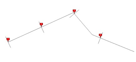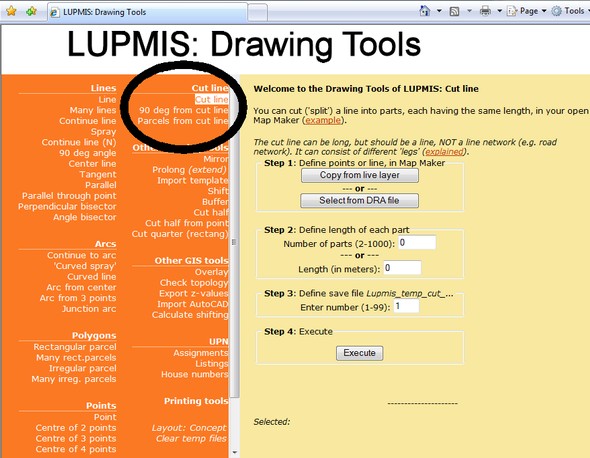 In addition to the cutting (tool above), this also places a line at each cutting point, which is perpendicular to the line. This will help to draw the sides of parcels along the line (road). You specify the length of these perpendicular lines and, as option, if you want them on both sides of the line (road) or only on one side.
