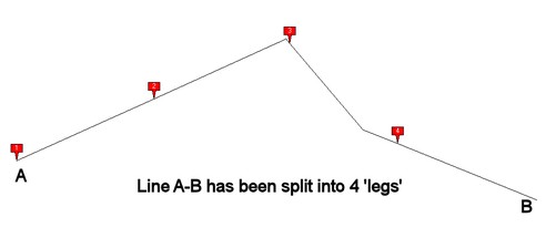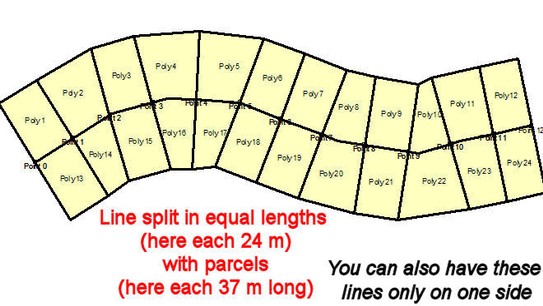 This is a most useful tool to create Local Plans with housing schemes. It allows to cut ('split') a line, like a road, in equal-length 'legs', based on either:
