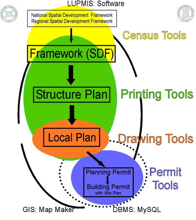 Integration of 'LUPMIS Tools' in the 3-tier land use planning system shows following chart: