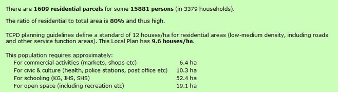 With this calculated population number, the land requirements are displayed for main planning features, which gives a perspective of their shortage or abundancy, when comparing with the planned areas above: