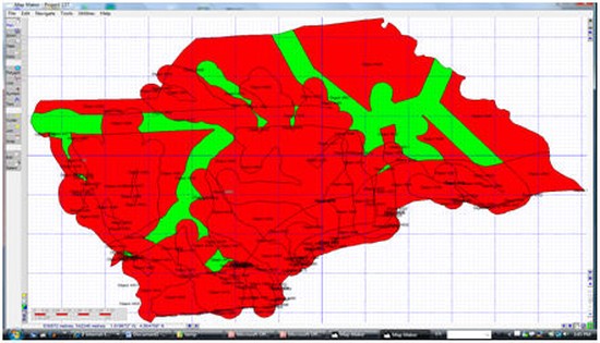 For display in Map Maker, see Part 3 of Chapter 4.5. The green areas in the example below indicate the sites suitable for siting industrial activity.