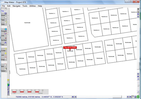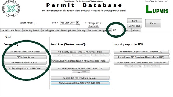 It is possible – and for some operations necessary – to import data, which are in the DRA file, to the Permit Database, such as the land use planning zone (in ‘style’), the precise location (x and y), the size of the parcel etc. These data are automatically integrated to the main data table of parcels through the ‘Import from GIS (Local Plan --> PDB)’ button.