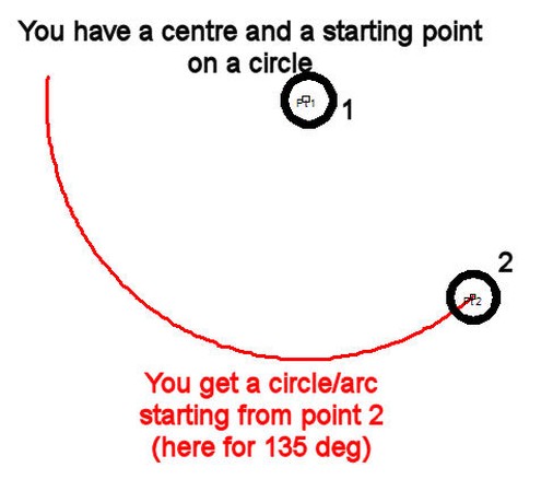 This tool lets you define an arc (or circle) from 2 points: Number 1 is the centre of the arc, number 2 the start point. You only enter the direction (clockwise or anticlockwise) and for how many degrees the arc should run (e.g. 90 deg for a quarter circle).