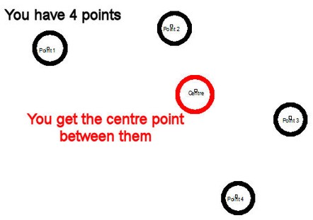 If you have 4 points and you want to know the exact centre point between these 4 points, use this tool. It uses the average of all these 4 points in x and in y direction.