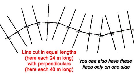 In addition to the cutting (tool above), this also places a line at each cutting point, which is perpendicular to the line. This will help to draw the sides of parcels along the line (road). You specify the length of these perpendicular lines and, as option, if you want them on both sides of the line (road) or only on one side.