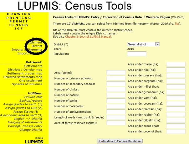As District figures, do not only refer to population numbers, but also to infrastructure (schools, clinics etc) and to production figures (agriculture, forest etc), the type of information will be selected in the next menu.