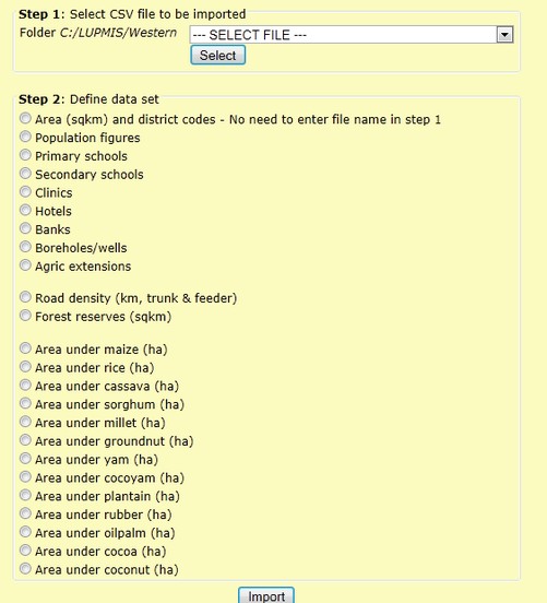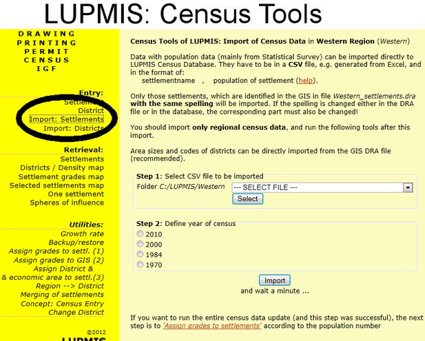 The import table should be a CSV table, which can be derived from Excel (Save As > CSV file) in the format of: name of settlement or District/Region , population figure . It is very important, that the spelling of settlement names is consistent, i.e. the same in the CSV file and in the GIS. If a name is to be changed, it has to be changed both in the import file and in the GIS.