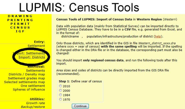 A faster way to enter data to the Census Database is the direct import of a table. Similar to manual entry, there is a difference between settlements and Districts/Regions.