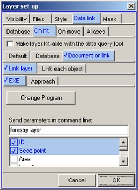 Choose the DRA file that you want to link to, in this example polygons.dra. In the Layer set up dialogue box go to Data link > On hit > Document or link > Link layer > EXE. Click on Change program to choose your program, here we have chosen a program called TestHit.exe.
